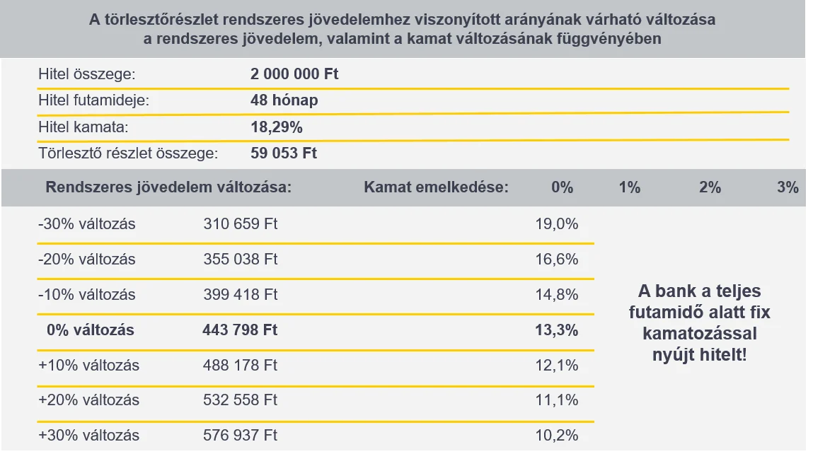 | Futamidő: | 48 hónap | Havi törlesztőrészlet: | 59 053 Ft |