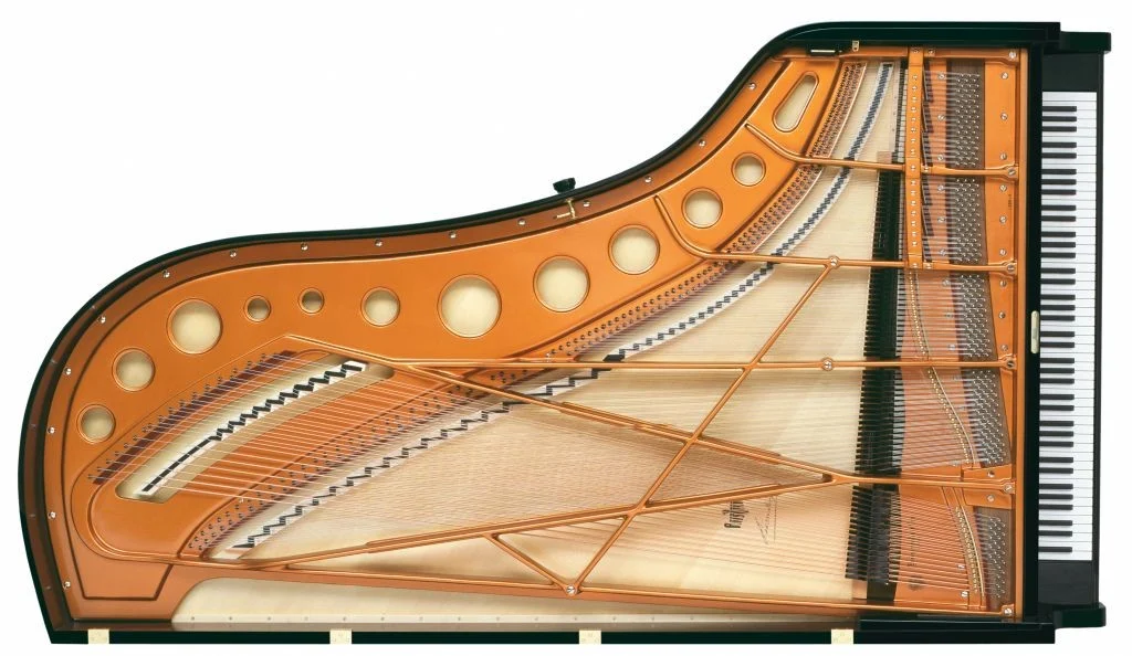 Elvileg nagyon hasonlít a hegedűre, az egész test - nem kizárólag a soundboard - amely támogatja a hangképzést. A zongorarúd tényleges magja egy 10 mm-es negyedfűrészből áll, melyet a mi kézművesünk különösen barázdáltan készítette, hogy lehetővé tegye a belső perem körüli sziluettre való hajlítást. Ez egyedülálló a Bösendorfer számára. Amikor egy hangot játszanak, az integrált lucfenyő komponensek akusztikusan aktívvá válnak, és egy teljes rezonáló testet alkotnak, amely lehetővé teszi, hogy az egész hangszer megszólaltassa a játékot. A hangszín és a legendás, tiszta és ragyogó hangzás rendkívül gazdag. Ez a komplex konstrukció a bécsi zongoraművészeti hagyomány része.