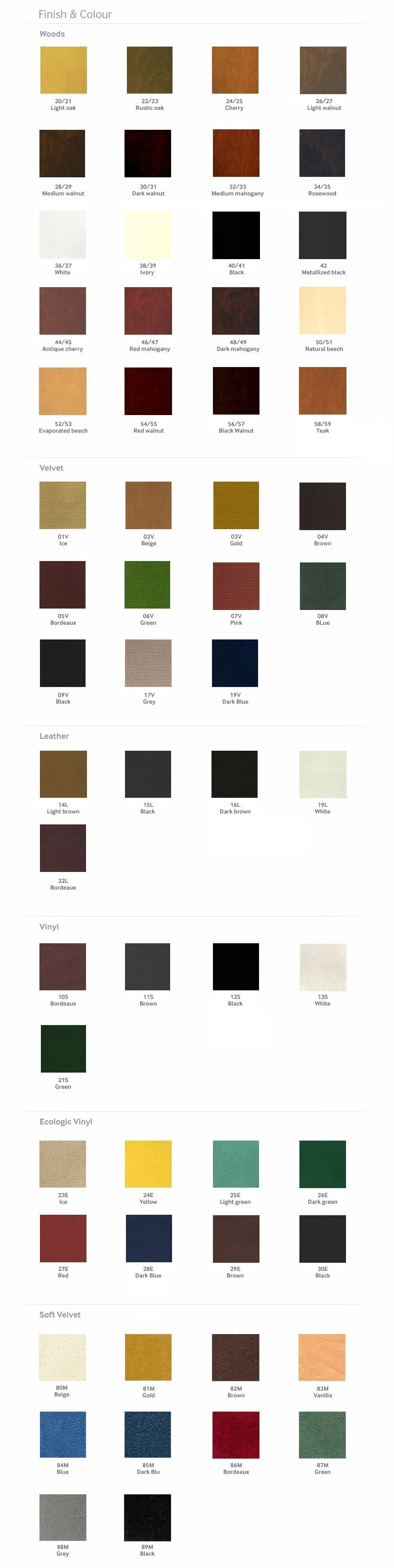 Minden modell a „100% made in Italy”, és bükkfa. Mindegyik modell kapható többféle színben, mind a magas fényes és matt.