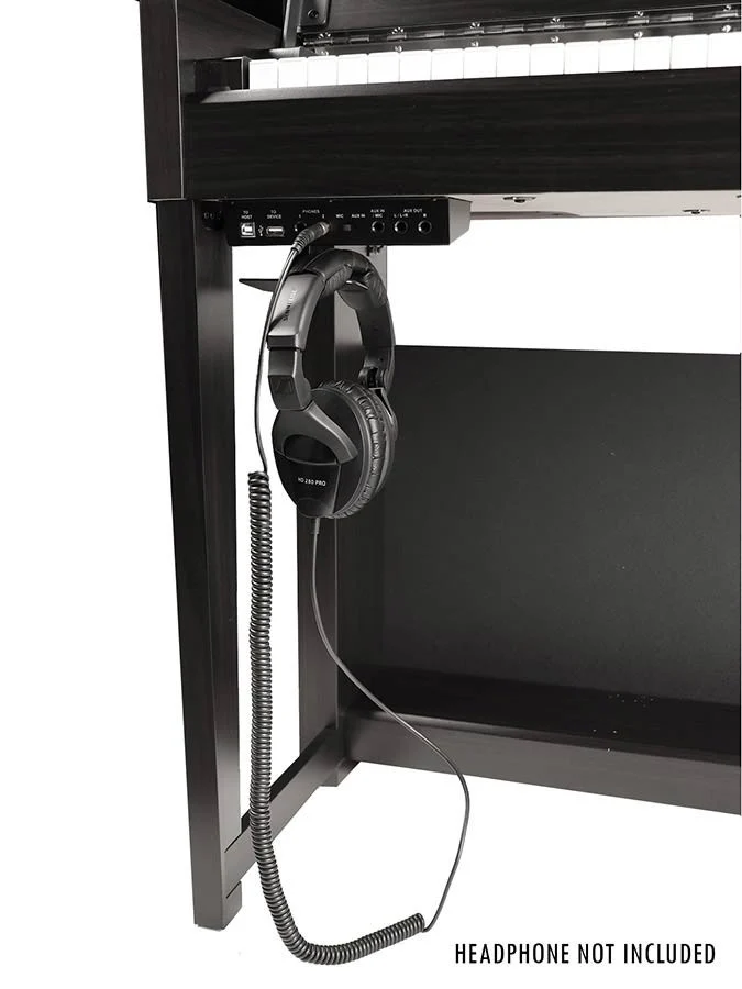 Csatlakozások: USB a fogadóhoz, USB a készülékhez, fejhallgató (1/4 "sztereó aljzat), Aux / Mic be (1/4" aljzat), Aux kimenet (1/4 "sztereo csatlakozó), pedálok (Sustain, Soft, Sostenuto )